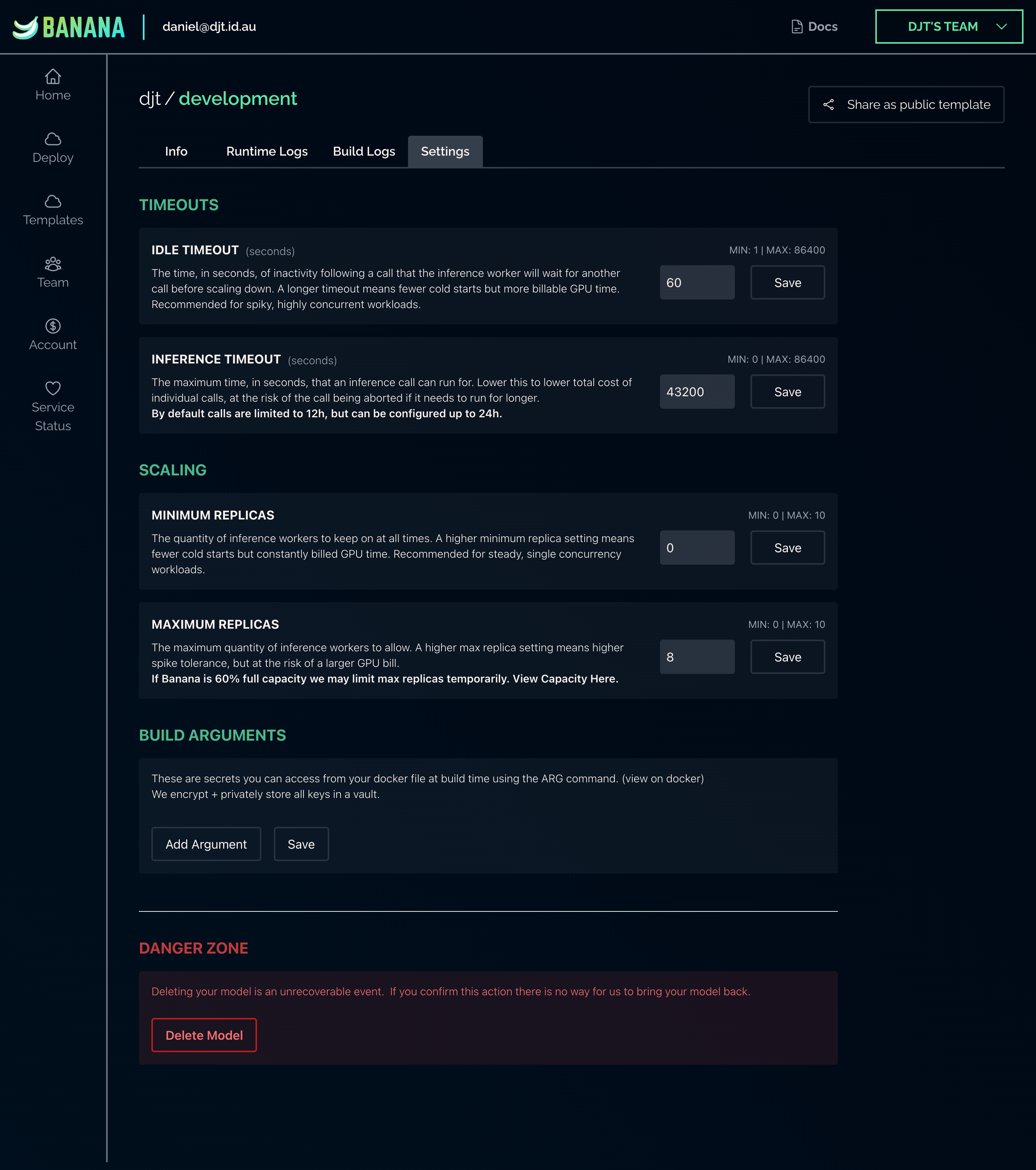 model settings page in Banana app