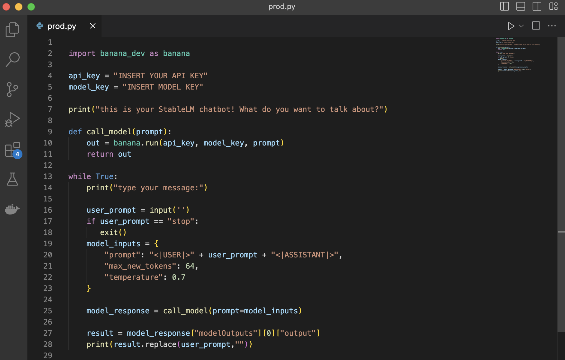 model_key = "INSERT MODEL KEY" print("this is your StableLM chatbot! What do you want to talk about?") def call_model(prompt):